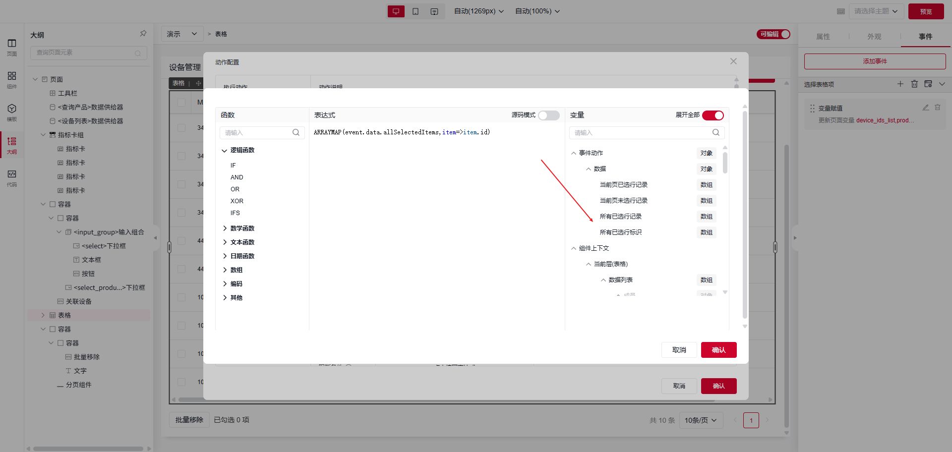 - 添加事件“选择表格项”,使用“变量赋值”将已选项存入页面变量(需先在页面数据中定义该变量)。