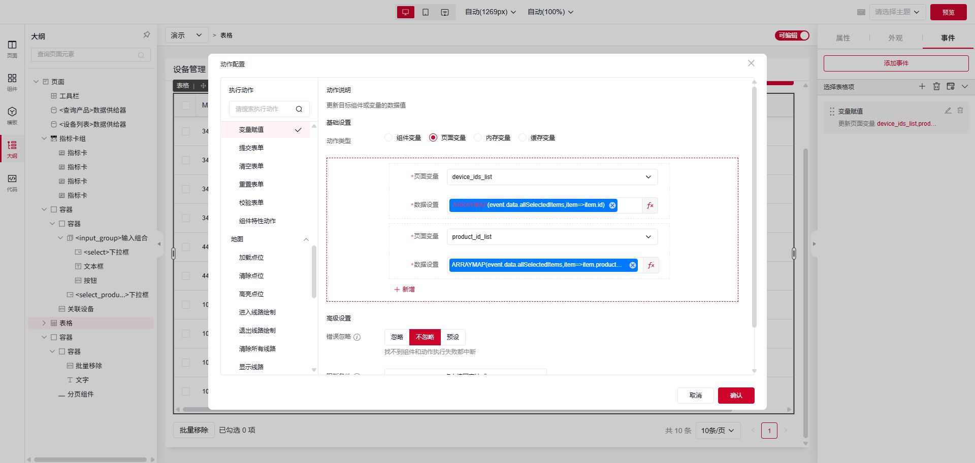 - 配置“批量移除”动作:在属性高级中启用二次确认并设置提示文本(例如“确定要移除该设备?”);在事件中添加“发送请求”或“更新表数据”以执行移除操作。