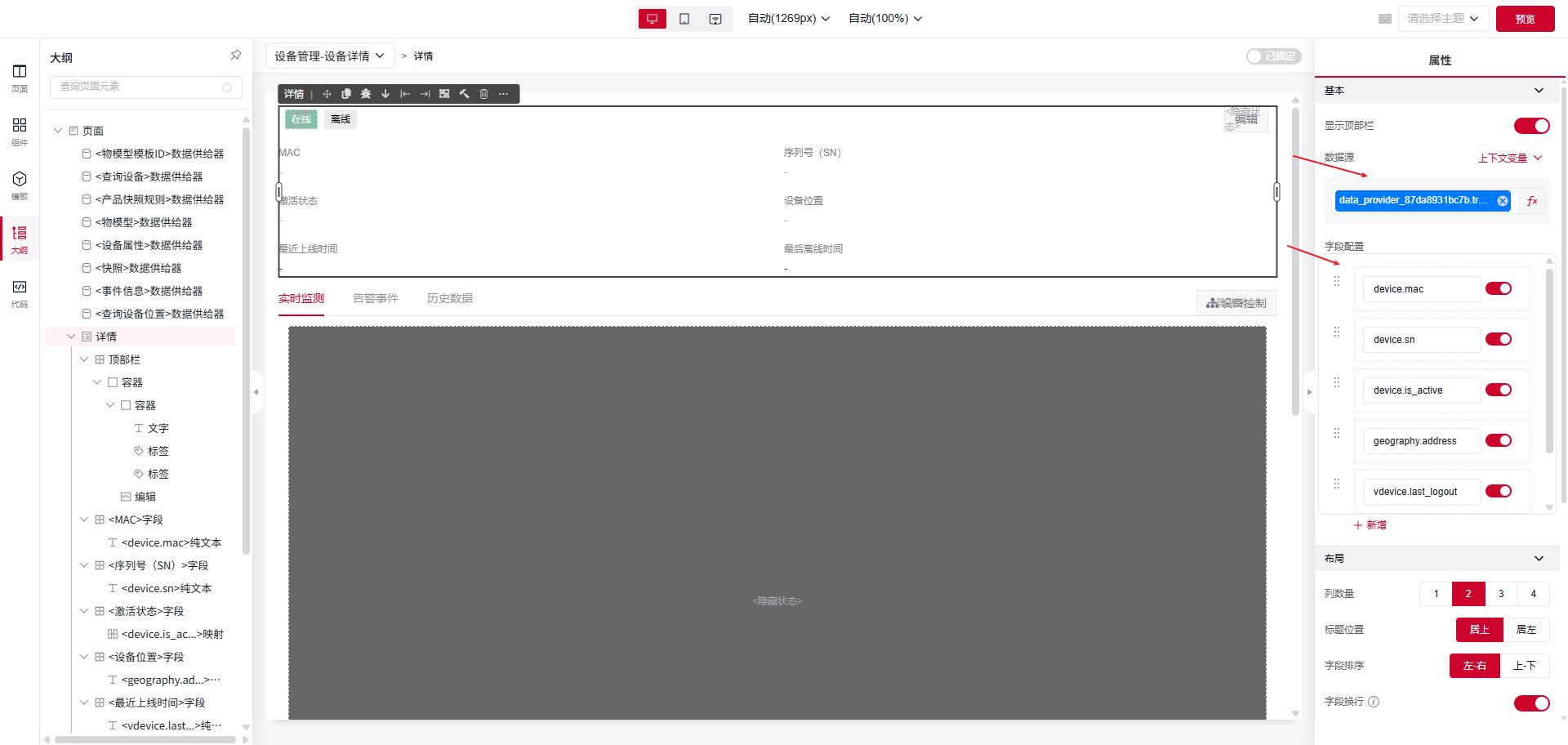 - 在第一个选项卡添加“视频监控”“设备状态”等组件,确保在属性中关联设备标识字段(例如物联平台设备 ID)。