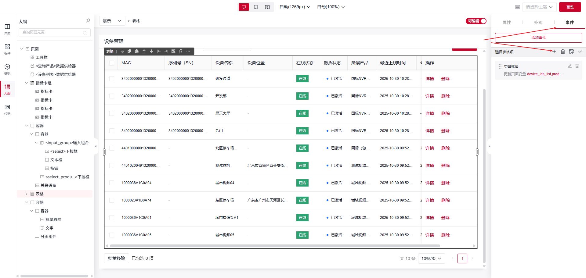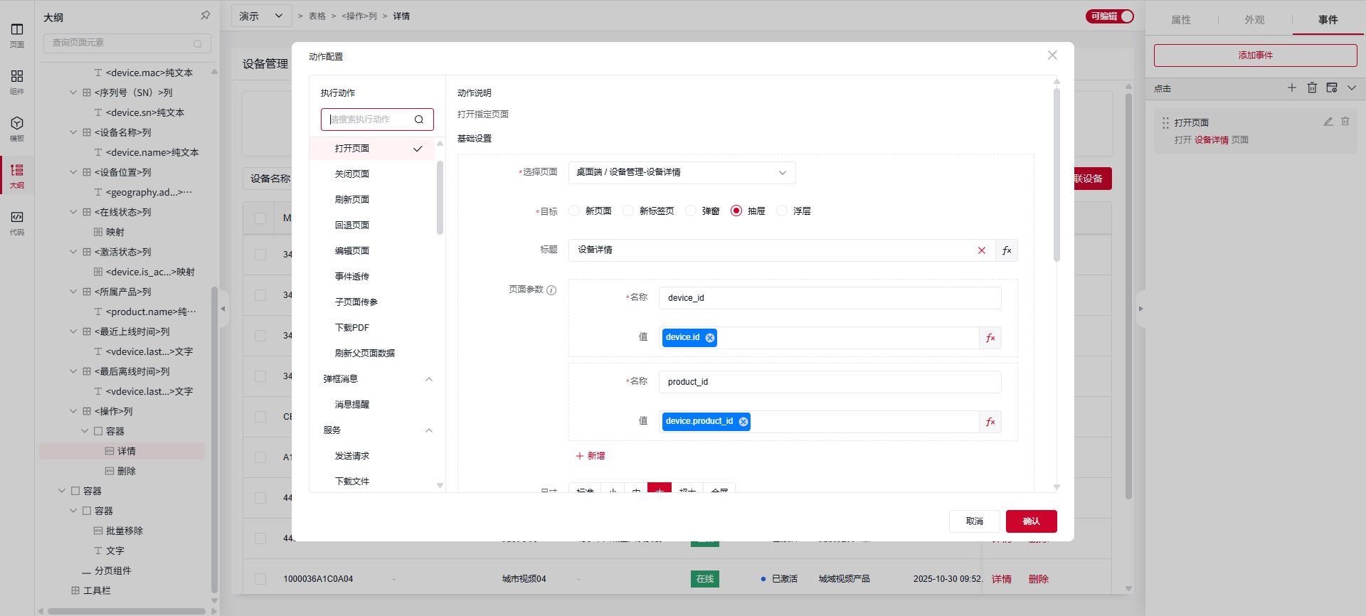 - 回到“设备管理”列表页,选中表格的操作列“详情”按钮,配置事件为“打开页面”。