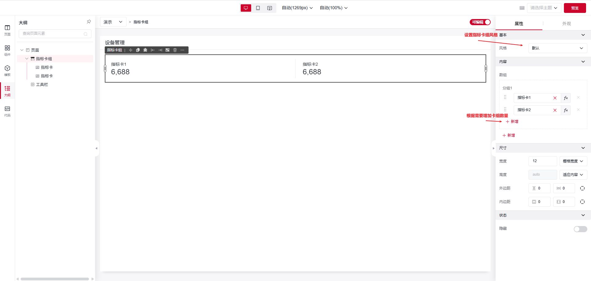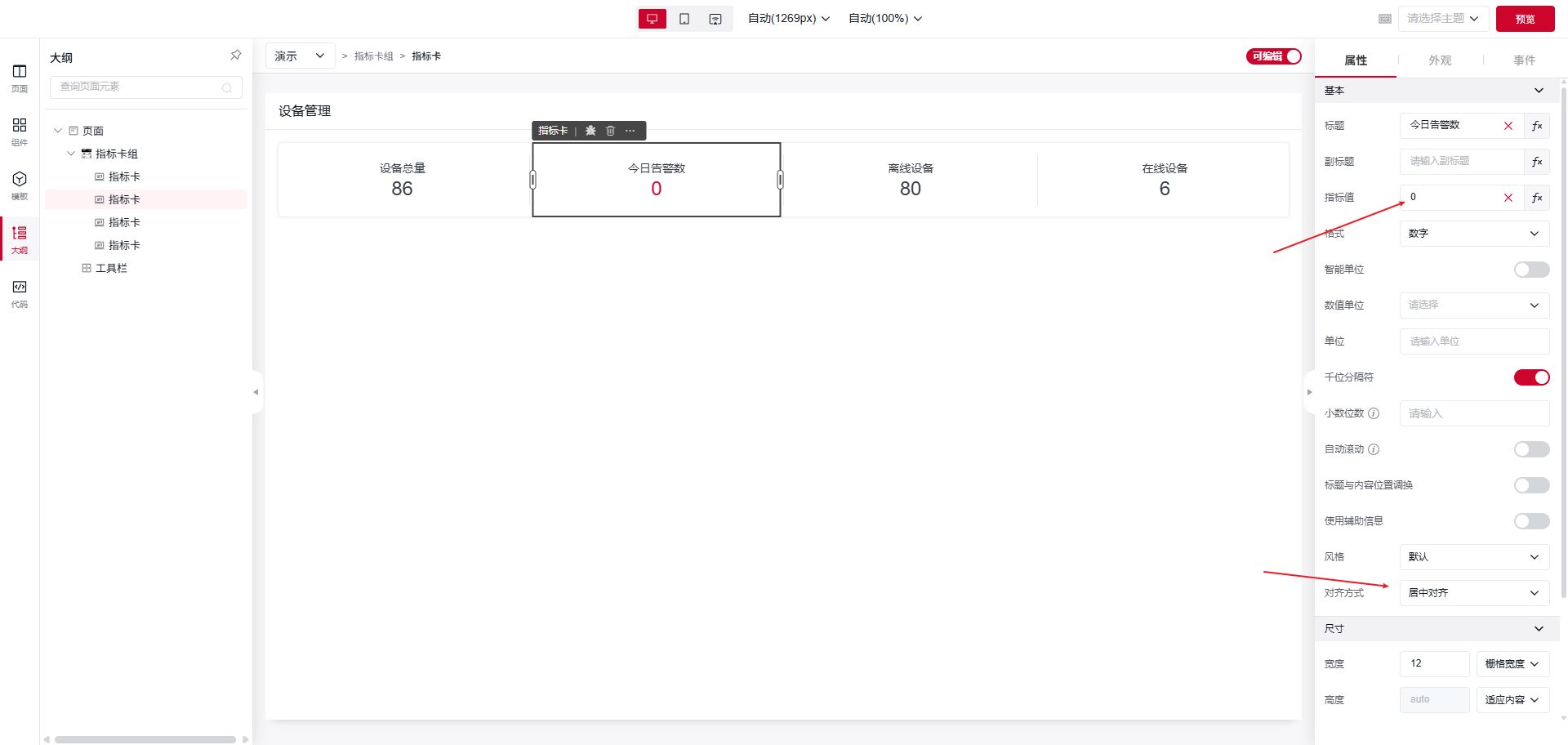 - 新增指标卡并修改名称与指标值(支持固定值或绑定字段)。