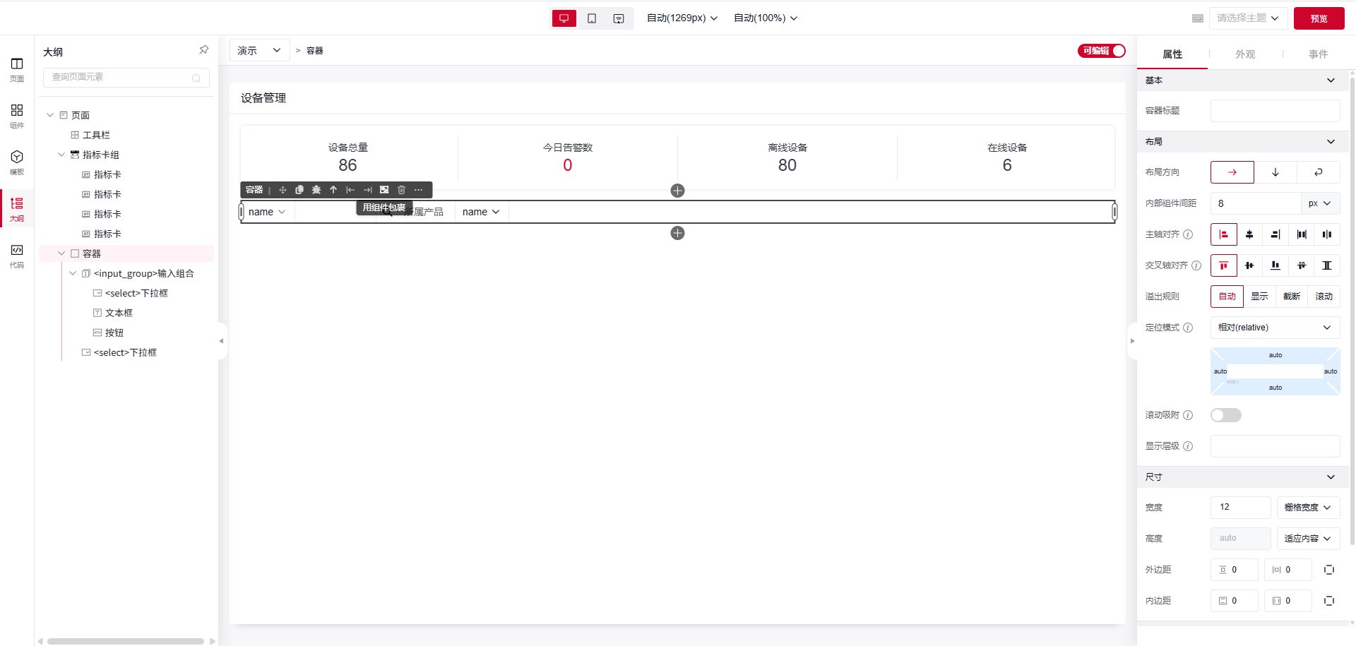 - 添加容器,放入输入组合(用于搜索)和下拉框(用于筛选),调整组件宽度。
