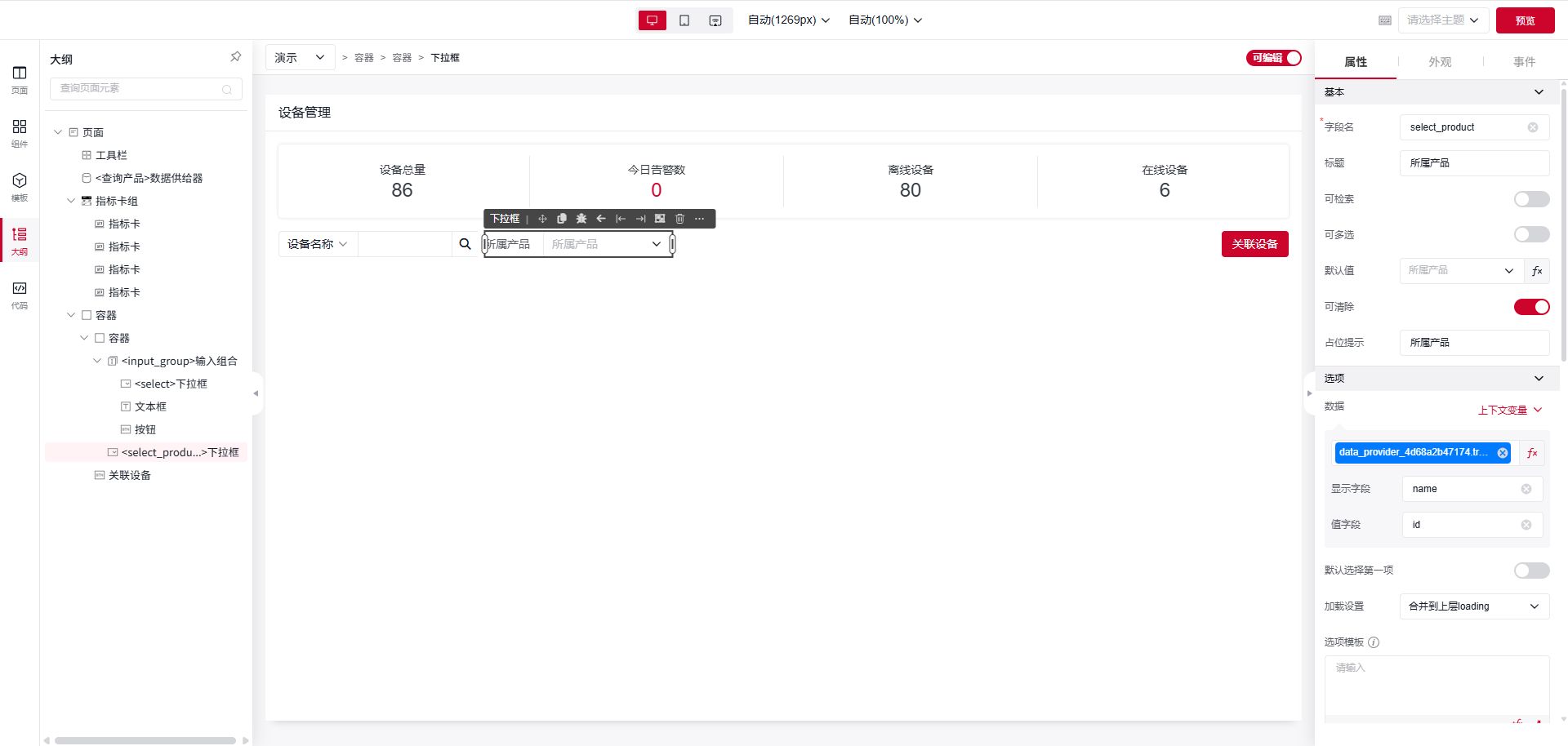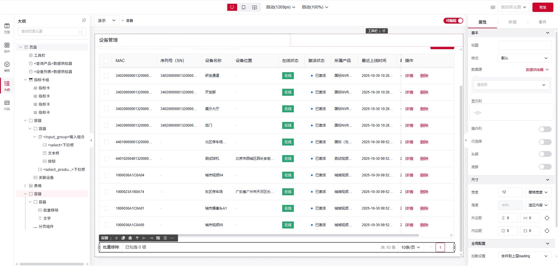 云智易物联网平台支持快速构建设备管理类应用页面。本文以“设备管理”应用为示例,介绍如何通过页面设计功能搭建典型的设备管理前端,包括列表页、详情页及常用组件的配置要点。