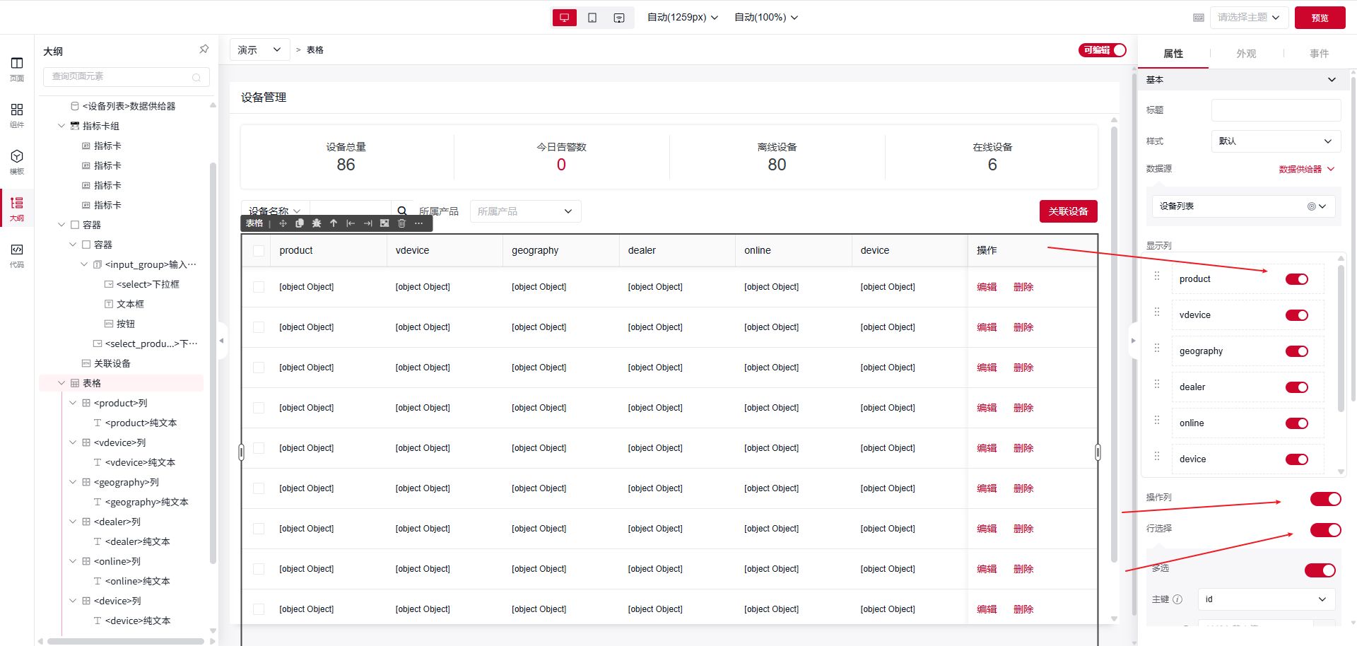 - 为表头添加操作按钮(如“关联设备”,样式通常设为主色)。