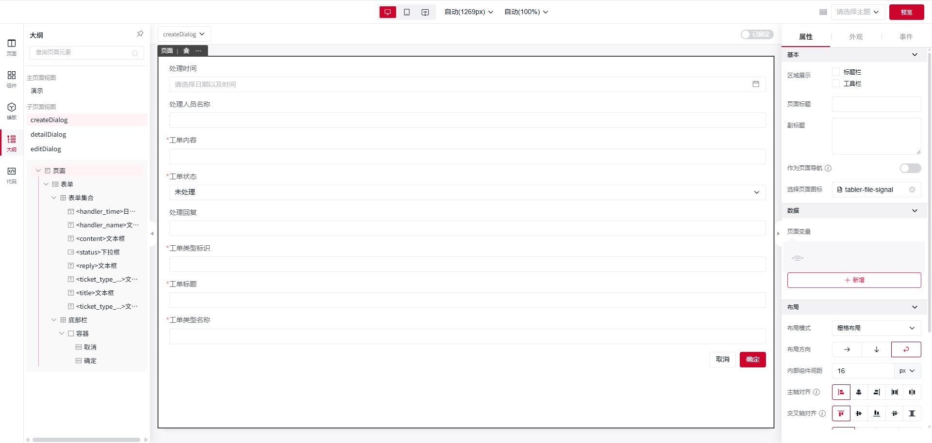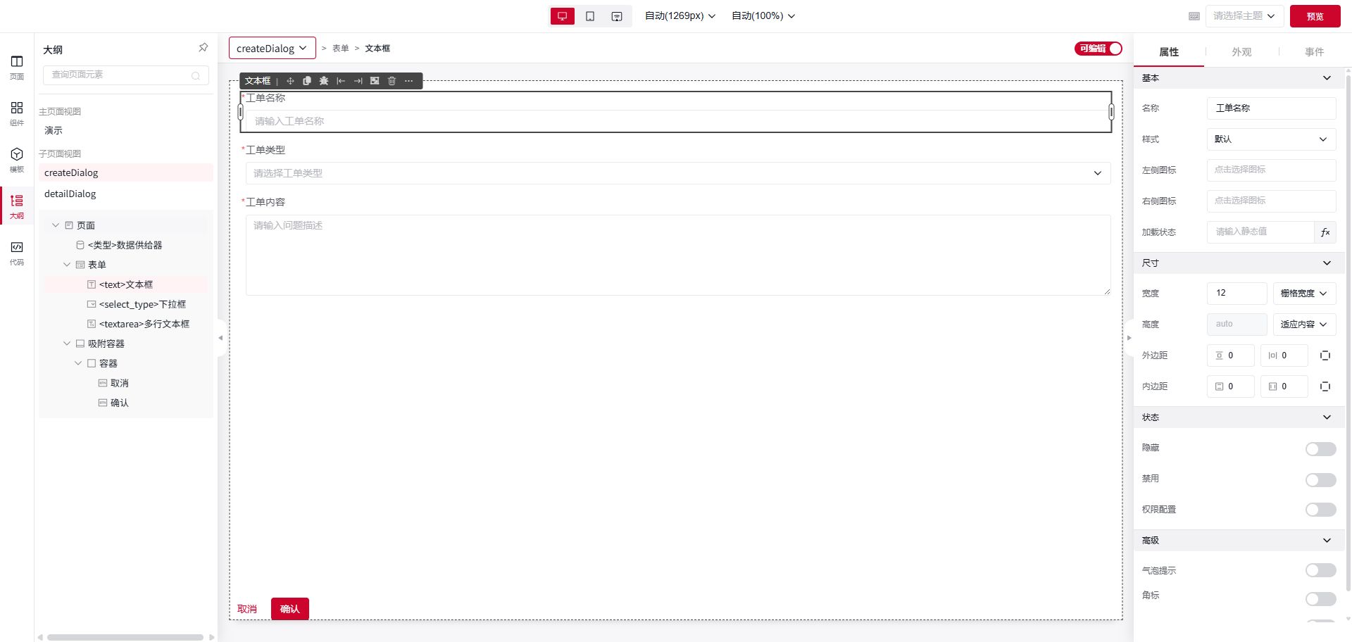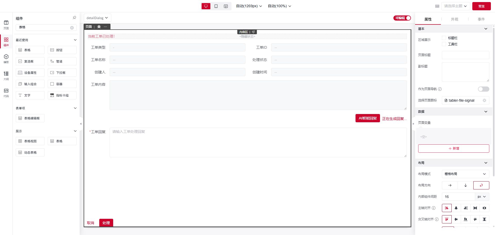 ⚠️ 注意:可以在‘表格生成器’阶段先配置好哪些表单项是需要提交表单使用的。 - 选择‘editDialog’页面,配置详情 1、调整表单样式,禁用不允许修改的表单项 2、添加‘按钮’(AI智能回复)