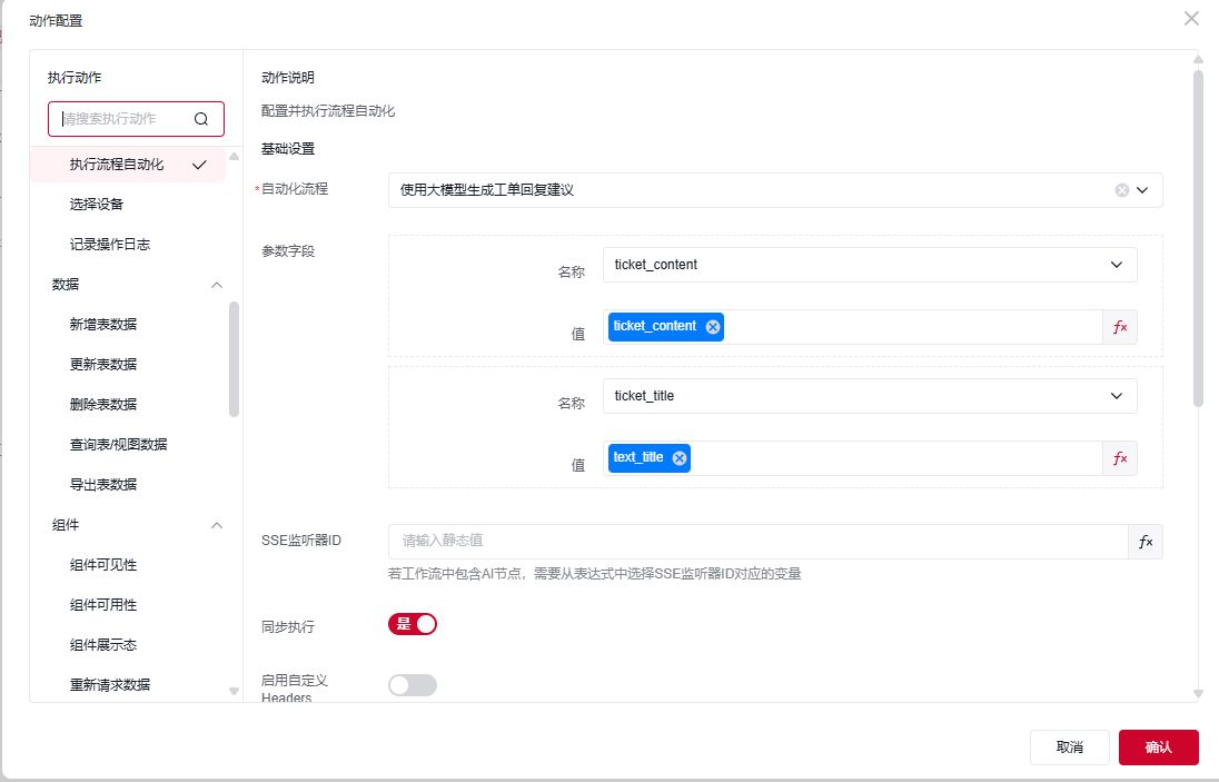 - ‘AI智能回复’绑定工作流 1、选中‘AI智能回复’ 2、选中右侧‘事件’,进行‘动作配置’ 3、‘动作配置’中选择‘执行流程自动化’,配置传参