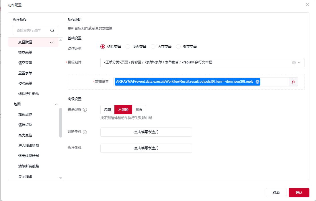 4、‘动作配置’中选择‘变量赋值’,将工作流的执行结果赋值到‘工单回复’的表单项上