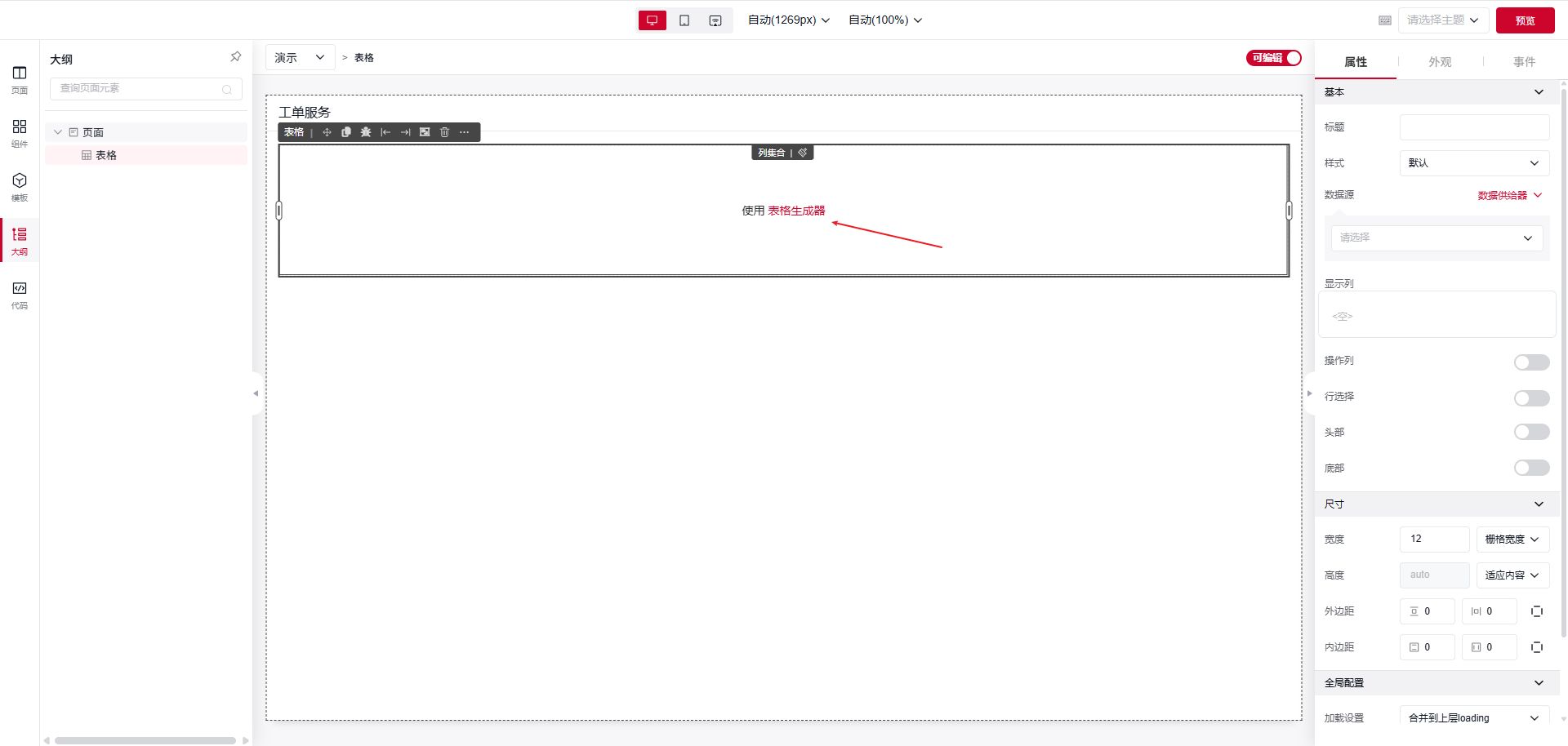 - 选择数据源‘ticket’,配置字段列顺序,名称,确定后生成表格及增删改的页面